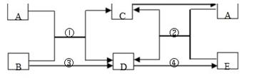 A、B、C、D、E是初中化學(xué)常見(jiàn)的五種物質(zhì)。A、D、E為氧化物,其中A為黑色