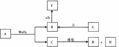 們有如下圖所示的轉(zhuǎn)化關(guān)系(部分產(chǎn)物已略去)。已知A、C是無(wú)色液體,大量排放F會(huì)引起溫室效應(yīng),G是紫黑色固體。