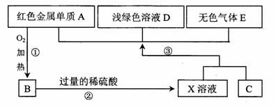 A、B、C、D、E為初中化學(xué)常見的物質(zhì),其中A、C為金屬單質(zhì),E為非金屬單質(zhì),X溶液顯藍(lán)色,下圖是它們之間的相互轉(zhuǎn)化關(guān)系。(已知氧化銅能跟稀硫酸反應(yīng)生成硫酸銅和水)請回答: