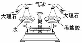 在天平兩端各放等質(zhì)量的兩個(gè)錐形瓶(瓶口用單孔塞和導(dǎo)管連接起來(lái),氣球中裝有等質(zhì)量的大理石),如圖所示。