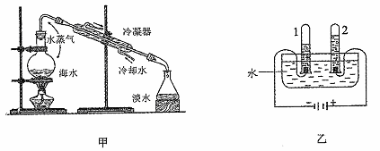 下圖中甲是淡化海水的模擬裝置,乙是電解水的裝置。