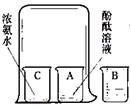 如圖所示,將酚酞溶液分別倒入A、B兩個(gè)小燒杯中,另取一個(gè)小燒杯C,加入約5 mL濃氨水。用一個(gè)大燒杯罩住A、C兩個(gè)小燒杯。