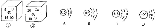(5分)下圖①、②是氧元素、鈣元素在元素周期表中的信息,A、B、C、D是四種粒子的結(jié)構(gòu)示意圖。![]()