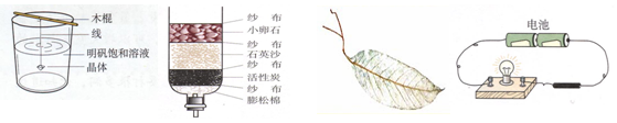 | A.制取明礬晶體 | B.自制凈水器凈水 | C.自制“葉脈書簽” | D.石墨導(dǎo)電實(shí)驗(yàn) |