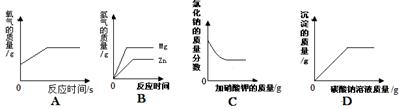 | B.向等質量的鎂、鋅中分別加入足量的稀硫酸 |