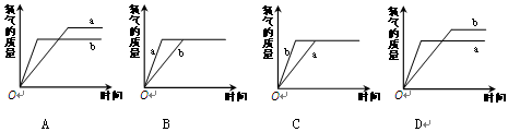 已知固體氯酸鉀在加熱條件下可以分解,生成氧氣。如果用二氧化錳作催化劑則可以加快其分解速度。已知a為固體氯酸鉀,b為混有少量二氧化錳的固體氯酸鉀,且a和b的質(zhì)量相等,當(dāng)分別同時(shí)加熱a和b至完全反應(yīng)時(shí),能正確表示生成氧氣的質(zhì)量隨反應(yīng)時(shí)間而變化的圖像是![]()