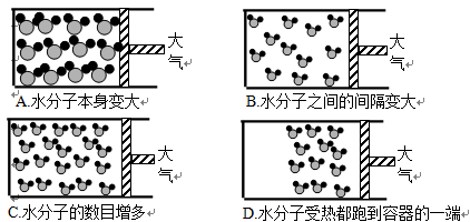 右圖表示封閉在某容器中的少量液態(tài)水的微觀示意圖(該容器的活塞可以左右移動)。煮沸后,液態(tài)水變成水蒸氣。在這一過程中,發(fā)生的變化是 .![]()