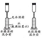 將等體積的滴有紅墨水的水和酒精分別緩緩注入右圖所示的裝置中,蓋緊膠塞將兩種液體混合,實(shí)驗(yàn)現(xiàn)象如圖所示。該實(shí)驗(yàn)?zāi)艿玫降慕Y(jié)論是![]()