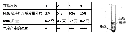 (2011年浙江溫州,28題)科學興趣小組想研究影響過氧化氫(H2O2)分解速度的因素。在四支試管中分別加入0.2克二氧化錳 (MnO2)粉末,然后加入等量的不同溶質(zhì)質(zhì)量分數(shù)的過氧化氫溶液,觀察氣泡產(chǎn)生的速度,記錄如下:![]()
