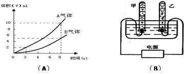 圖(A)為電解水生成氣體與時(shí)間關(guān)系圖,圖(B)是電解水的簡(jiǎn)易裝置。試回答下列問題:![]()