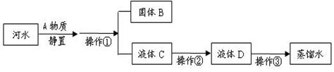 (8分)小剛收集到一瓶渾濁的河水,他要模擬自來(lái)水廠的凈水過(guò)程,最終制成蒸餾水。其實(shí)驗(yàn)過(guò)程如下所示。請(qǐng)回答以下問(wèn)題。![]()