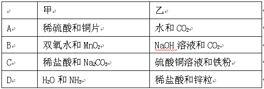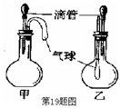 如下圖所示的甲、乙兩個裝置中,膠頭滴管中吸入某種液體,平底燒瓶中放入另一種物質(zhì),擠壓膠頭滴管加入液體,一段時間后甲裝置中的氣球明顯脹大,乙裝置中氣球無變化(忽略液體體積對氣球體積的影響)。則滴管和燒瓶中所用試劑可能是![]()