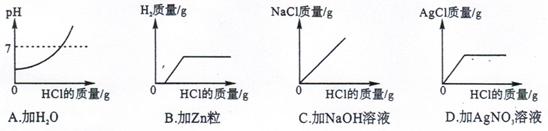 向一定量的稀鹽酸中,分別加入足量的水、鋅、氫氧化鈉溶液、硝酸銀溶液,下列圖示正確的是![]()