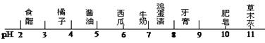 被蜜蜂等含蟻酸的昆蟲叮咬后,立即涂抹牙膏可消腫減痛。某學生將食醋、牛奶、牙膏、廚房清潔劑分別放入等質量的水中,逐一進行了pH的測定,并表示在下面的數軸上,其中能表示牙膏溶于水形成溶液的pH的是