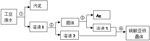 有一種工業(yè)廢水,其中含有大量的硫酸亞鐵,少量的銀離子以及污泥。某同學(xué)設(shè)計(jì)了一個(gè)既經(jīng)濟(jì)又合理的方法回收銀和硫酸亞鐵晶體。方案流程如下:![]()