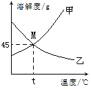 B.M點(diǎn)表示在t℃時(shí)甲、乙兩種物質(zhì)的溶解度相等