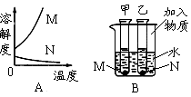 A圖是物質M和N的溶解度曲線。B圖中甲、乙試管分別盛有M、N的飽和溶液,試管底均有未溶解的M、N固體。向燒杯中加入一種物質后,甲中的固體增加,乙中的固體減少,則加入的物質可能是![]()