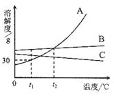 B.t2℃時(shí), 將A、B、C三種物質(zhì)的飽和溶液降溫至t1℃,C溶液中溶質(zhì)的