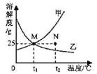 | B.在t1℃時(shí),M點(diǎn)表示甲、乙兩物質(zhì)的溶解度相等 |