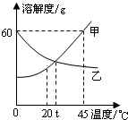 | D.將45℃時,甲、乙的飽和溶液分別降溫至t℃時,兩溶液均析出晶體 |