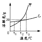 | C.等質(zhì)量的甲、乙飽和溶液從t3℃降溫到t1℃,析出晶體(無結(jié)晶水)的質(zhì)量甲>乙 |