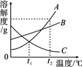 圖是A、B、C三種物質的溶解度曲線,當等質量的A、B、C三種物質的飽和溶液同時從t=2℃降溫到t=1℃時,其中溶質質量分數沒有發(fā)生改變的是![]()
