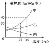 | C.將35℃時丙的飽和溶液降溫到25℃,則其溶液的溶質(zhì)質(zhì)量分?jǐn)?shù)不變 |