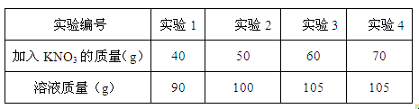 (2)在一定溫度下,向質(zhì)量均為50g的四份水中分別加入一定質(zhì)量的KNO3固體,攪拌至充分溶解(如有不溶解的KNO3,則過濾除去),得到溶液。加入KNO3的質(zhì)量與得到相應(yīng)