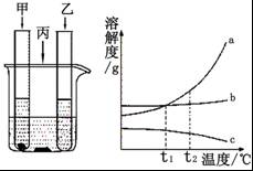 圖1是甲、乙、丙三種固體物質(zhì)的溶解度曲線。根據(jù)圖1、圖2回答:![]()