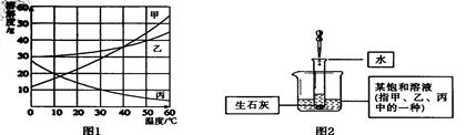 (2)圖2中,試管里預(yù)先裝有少量生石灰,當(dāng)往試管中加入適量水時(shí),反應(yīng)放出的熱量使燒杯中某飽和溶液析出固體(不考慮水分蒸發(fā))。請(qǐng)判斷:該飽和溶液中溶質(zhì)是 _________________(填“甲”或“乙”或“丙”)。