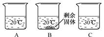 向裝有等量水的A、B、C三個燒杯中分別加入10 g、25 g、25 g NaNO3固體,充分溶解后,現象如下圖所示。![]()