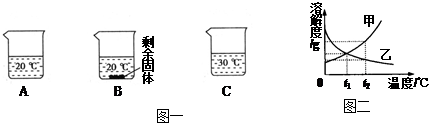 向裝有等量水的A、B、C燒杯中加入10g、20g、25g的NaNO3固體,充分溶解后,現(xiàn)象如圖一所示:![]()