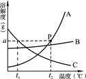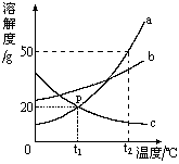 如圖是a、b、c三種物質(zhì)的溶解度曲線,a與c的溶解度曲線相交于P點。據(jù)圖回答:![]()