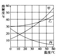 甲、乙、丙三種物質(zhì)的溶解度曲線如右圖所示。據(jù)圖回答:![]()