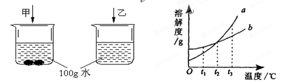圖1是t1℃時相同質(zhì)量的甲、乙兩物質(zhì)同時放入100g水中的溶解情況,圖2是它們的溶解度隨溫度變化的函數(shù)關(guān)系圖,據(jù)此回答下列問題:![]()