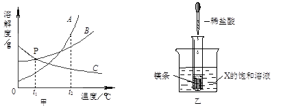(3)如乙圖所示,20℃時,把試管放入盛有X的飽和溶液的燒杯中,在試管中加入幾小段鎂條,再加入5mL稀鹽酸,立即產(chǎn)生大量的氣泡,同時燒杯中出現(xiàn)渾濁,則X可能為A、B、C三種固體物質(zhì)中的 。![]()