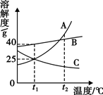 (2)t2℃時,將A、B、C各25 g分別放入100g水中,能形成飽和溶液的物質(zhì)是 ,將其轉(zhuǎn)化為不飽和溶液的兩種方法有 、 。