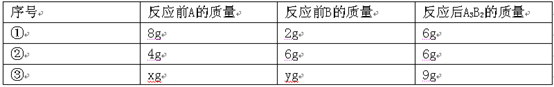 A和B可發(fā)生如下反應(yīng):3A+2B====A3B2,某學(xué)生做了3次該實(shí)驗(yàn)(每次均充分反應(yīng)),反應(yīng)前A和B的質(zhì)量和都是l0克.有關(guān)實(shí)驗(yàn)數(shù)據(jù)見(jiàn)右表,X:Y的比值可能為
