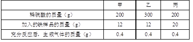 某課外興趣小組對(duì)一批鐵樣品(含有雜質(zhì),雜質(zhì)不溶于水,也不與稀硫酸反應(yīng))進(jìn)行分析,甲、乙、丙三位同學(xué)分別進(jìn)行實(shí)驗(yàn),其中只有一位同學(xué)所取用的稀硫酸與鐵樣品恰好完全反應(yīng)。實(shí)驗(yàn)數(shù)據(jù)如下表:![]()