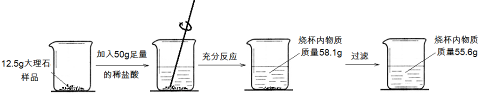 (3分)在研究某大理石樣品(雜質(zhì)不溶于水也不與鹽酸反應(yīng))的活動中,興趣小組同學(xué)進行了如下實驗,過程如圖所示:![]()