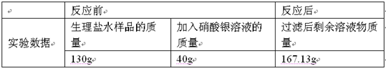 已知氯化鈉溶液和硝酸銀溶液反應(yīng)生成氯化銀(AgCl)沉淀和硝酸鈉。為測定某生理鹽水的溶質(zhì)質(zhì)量分?jǐn)?shù),將生理鹽水樣品與足量的硝酸銀溶液混合,有關(guān)實驗數(shù)據(jù)如下表:![]()