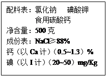 右圖是某種加鈣食鹽(在加碘食鹽中摻適量的食用碳酸鈣)包裝標(biāo)簽上的部分文字。為了測(cè)定此鹽中的碳酸鈣含量,取10 g這種鹽溶于水,加入足量鹽酸,生成0.132 g二氧化碳。計(jì)算此加鈣食鹽中碳酸鈣的質(zhì)量分?jǐn)?shù)。![]()