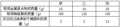 甲、乙、丙三位同學(xué)分別取鐵粉和銅粉的均勻混合物與某稀硫酸反應(yīng),所得數(shù)據(jù)如下:![]()