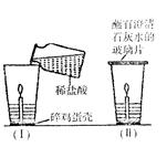 (1)如圖所示,小明把一只新鮮雞蛋放入盛水的玻璃杯中,雞蛋沉入水底(蛋殼的主要成分是碳酸鈣)。若向玻璃杯中逐漸滴加濃鹽酸,雞蛋殼表面將出現(xiàn)的現(xiàn)象是 ,相應(yīng)的化學(xué)反應(yīng)方程式為 。![]()