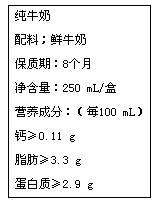右圖是某乳業(yè)公司純牛奶包裝標(biāo)簽上的部分文字。![]()