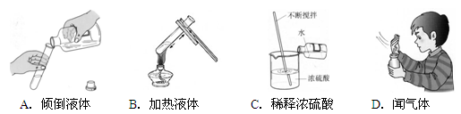 | A.加熱液體 | B.讀取液體體積 | C.稀釋濃硫酸 | D.點(diǎn)燃酒精燈 |