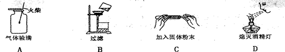 | A.往試管里送入固體粉末 | B.聞氣體氣氣味 | C.向試管里滴加液體 | D.加熱氯酸鉀制取氧氣 |