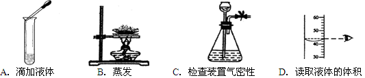 | A.傾倒液體 | B.稱量固體 | C.檢查氣密性 | D.給液體加熱 |
