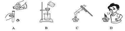 | A.點(diǎn)燃酒精燈 | B.過濾 | C.加熱液體 | D.稱量固體 |
