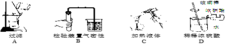 | A.取用固體粉末 | B.傾倒液體 | C.加熱液體 | D.過濾 |